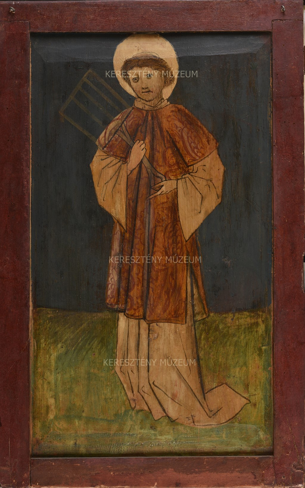 A belső oldalán Királyok Imádását, külső oldalán attribútumát, a rostélyt tartó Szent Lőrincet mutató tábla a leltározáskor a két keskeny, női szentet ábrázoló táblával volt triptychonná összeszerelve, ezért közös leltári számon szerepelnek.