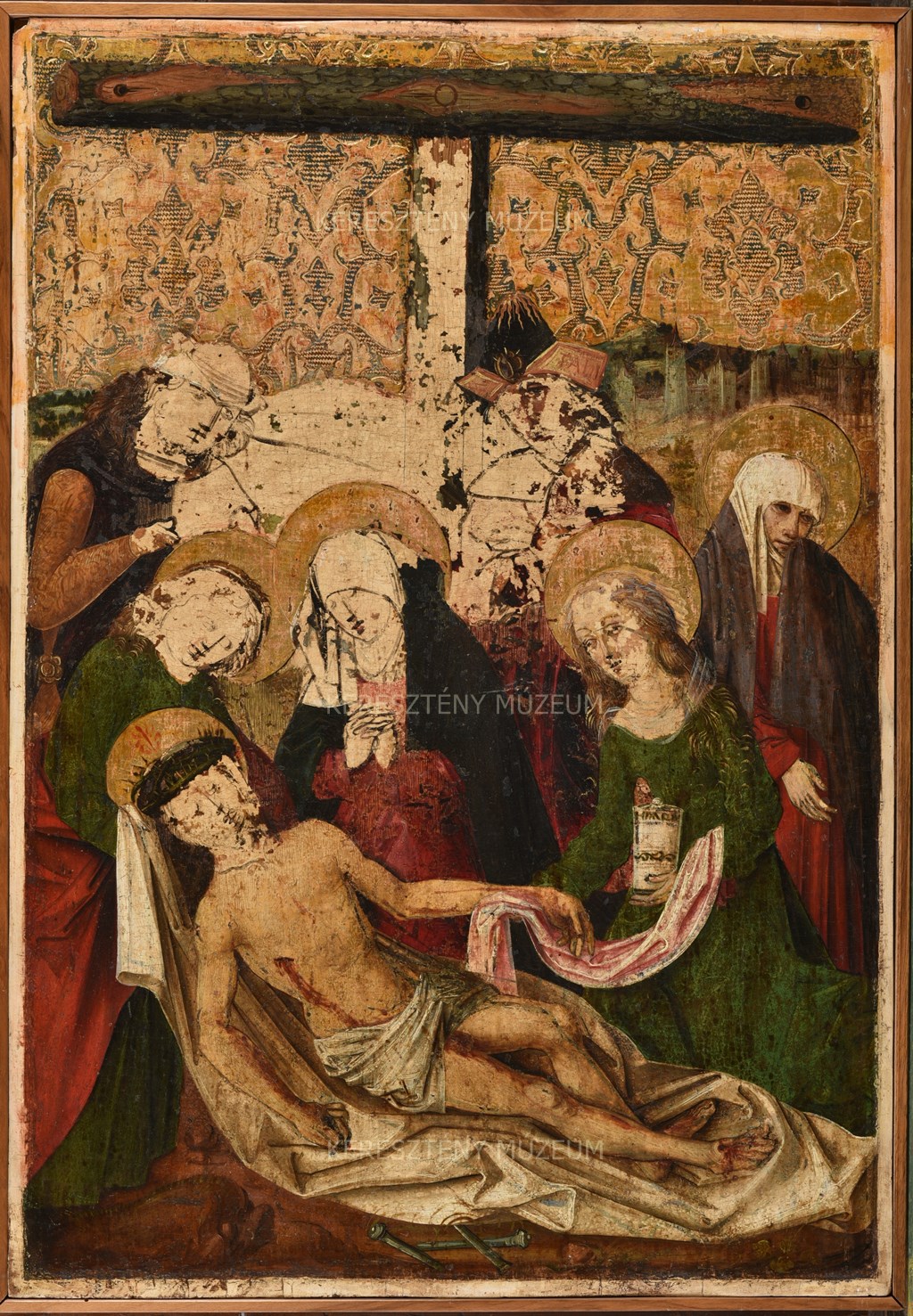A garamszentbenedeki Kálvária oltár egyik mozgózárnyának külső képe. Az oltár a garamszentbenedeki bencés kolostortemplom késő-gótikus berendezésének részét képezte. Szekrénye az 1905-ben, az esztergomi prímási palotában keletkezett tűzvészben megégett, szerkezetéből csak a fölső és a két oldalsó keretléc maradt meg elszenesedve. Erősen megsérültek a szekrény szobrai is. Az oltár ép állapotát a Simor-emlékkönyvben, 1886-ban közölt arhív felvételről jól ismerjük. A szekrény hátlapját eredetileg (minden bizonnyal kék alapon) arany csillagok díszítették.