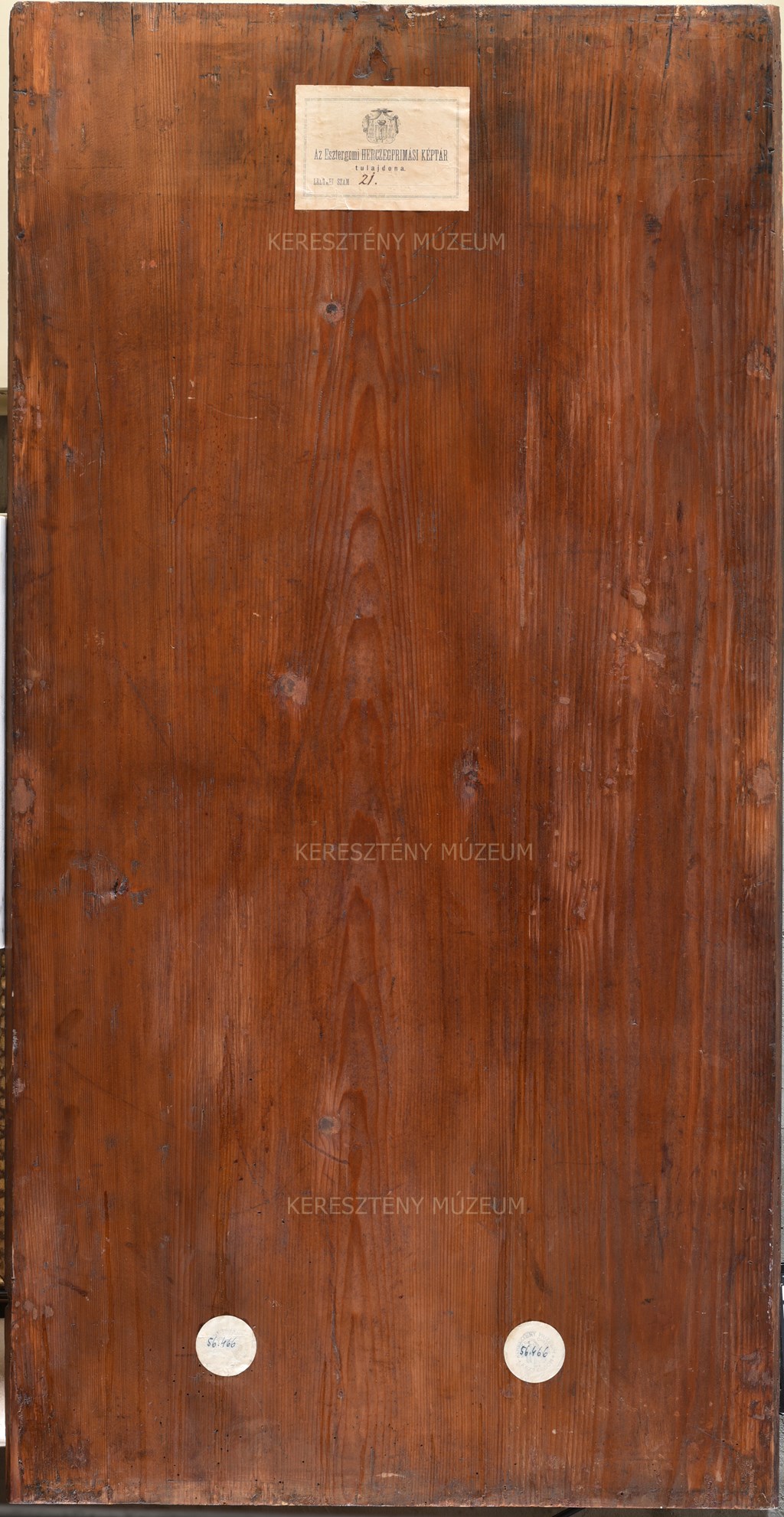 Hercegprímási Képtár 1879, 19. sz. – Magyar Sion 1885, 524, 673. – Maszlaghy 1891, 17-22 sz. – Gerevich Tibor: Az Újság 1916. július 14, 5 és július 20, 4. – Gerevich 1928, 214. – Genthon 1948, 124. – Boskovits-Mojzer-Mucsi 1964, 168-170. – Isolde Lübbecke: Zur Spätgotischen Tafelmalerei in Regensburg. In: Regensburg im Mittelalter. Beiträge zur Stadtgeschichte vom frühen Mittelalter bis zum Beginn der Neuzeit. Hg. Martin Angerer und Heinrich Wanderwitz. Regensburg 1995. 429-444. itt: 442, 97 jegyzet. (a proveniencia alapján elfogadja a regensburgi eredetet)