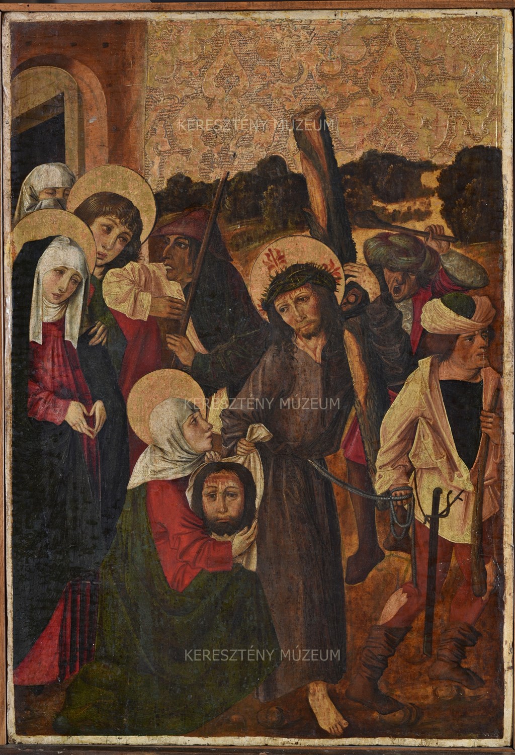 A garamszentbenedeki Kálvária oltár egyik mozgózárnyának külső képe. Az oltár a garamszentbenedeki bencés kolostortemplom késő-gótikus berendezésének részét képezte. Szekrénye az 1905-ben, az esztergomi prímási palotában keletkezett tűzvészben megégett, szerkezetéből csak a fölső és a két oldalsó keretléc maradt meg elszenesedve. Erősen megsérültek a szekrény szobrai is. Az oltár ép állapotát a Simor-emlékkönyvben, 1886-ban közölt arhív felvételről jól ismerjük. A szekrény hátlapját eredetileg (minden bizonnyal kék alapon) arany csillagok díszítették.